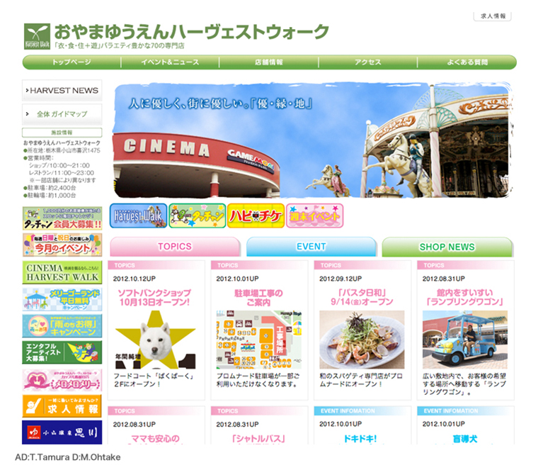 おやまゆうえんハーヴェストウォークのオフィシャルWEB SITE 制作及び月次更新運営。サイトに訪れたユーザーが情報に接触しやすいサイトを目的に2012年秋リニューアル。